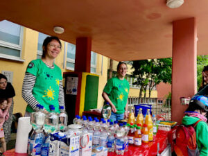 Während die Schüler und Schülerinnen mit ihren Familien Monsterkreisel und Marken-T-Shirts unter die Leute brachten, versorgten zahlreiche Helfer und Helferinnen des Fördervereins die Gäste mit Bratwürsten, Kuchen, Kaffee, Getränken und Schul-T-Shirts.